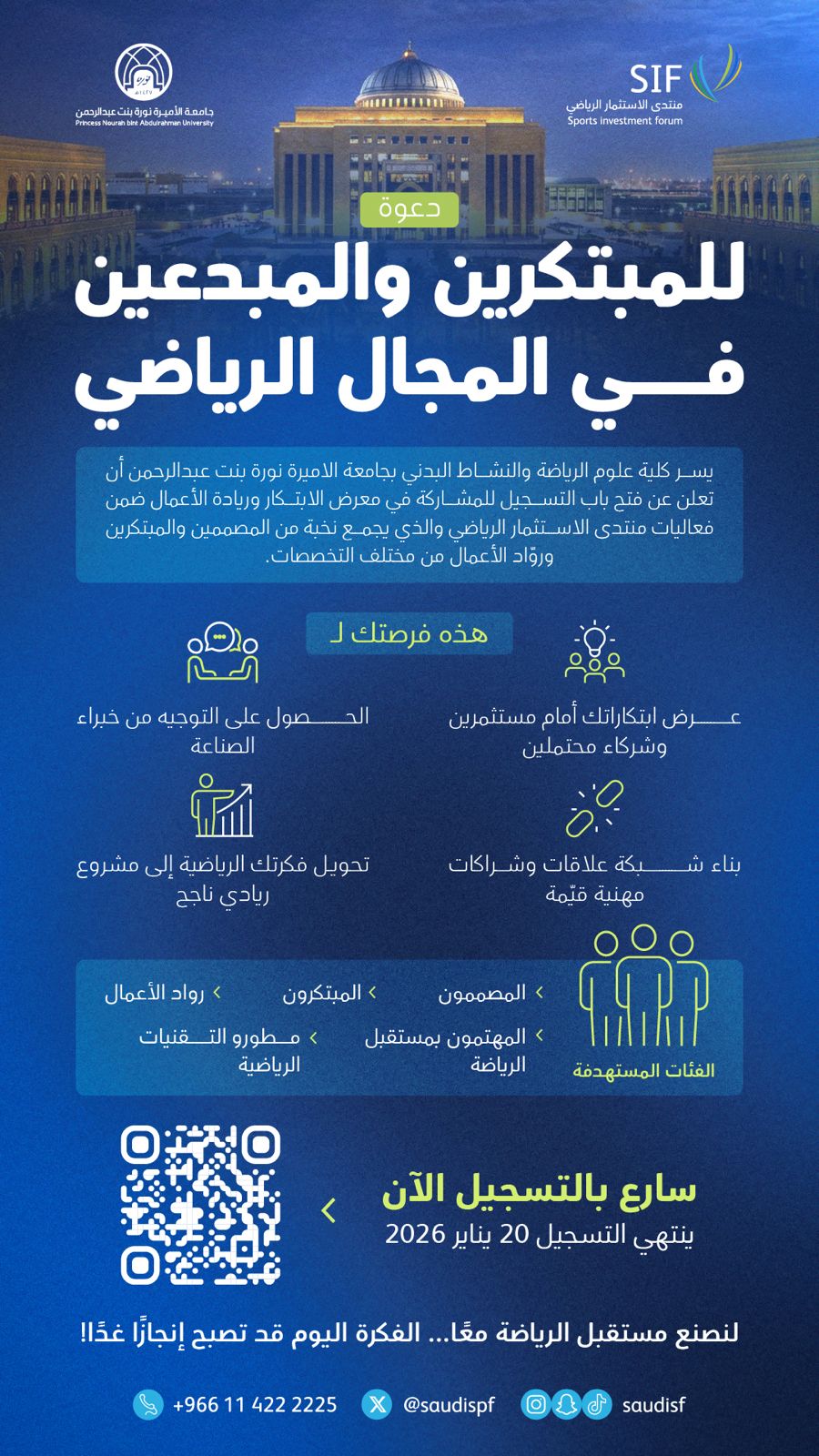 تدعو كلية علوم الرياضة والنشاط البدني بجامعة الأميرة نورة بنت عبد الرحمن المبتكرين والمبدعين في المجال الرياضي للمشاركة في معرض الابتكار وريادة الأعمال ضمن فعاليات منتدى الاستثمار الرياضي، الذي يجمع نخبة من المصممين ورواد الأعمال والخبراء من مختلف التخصصات.